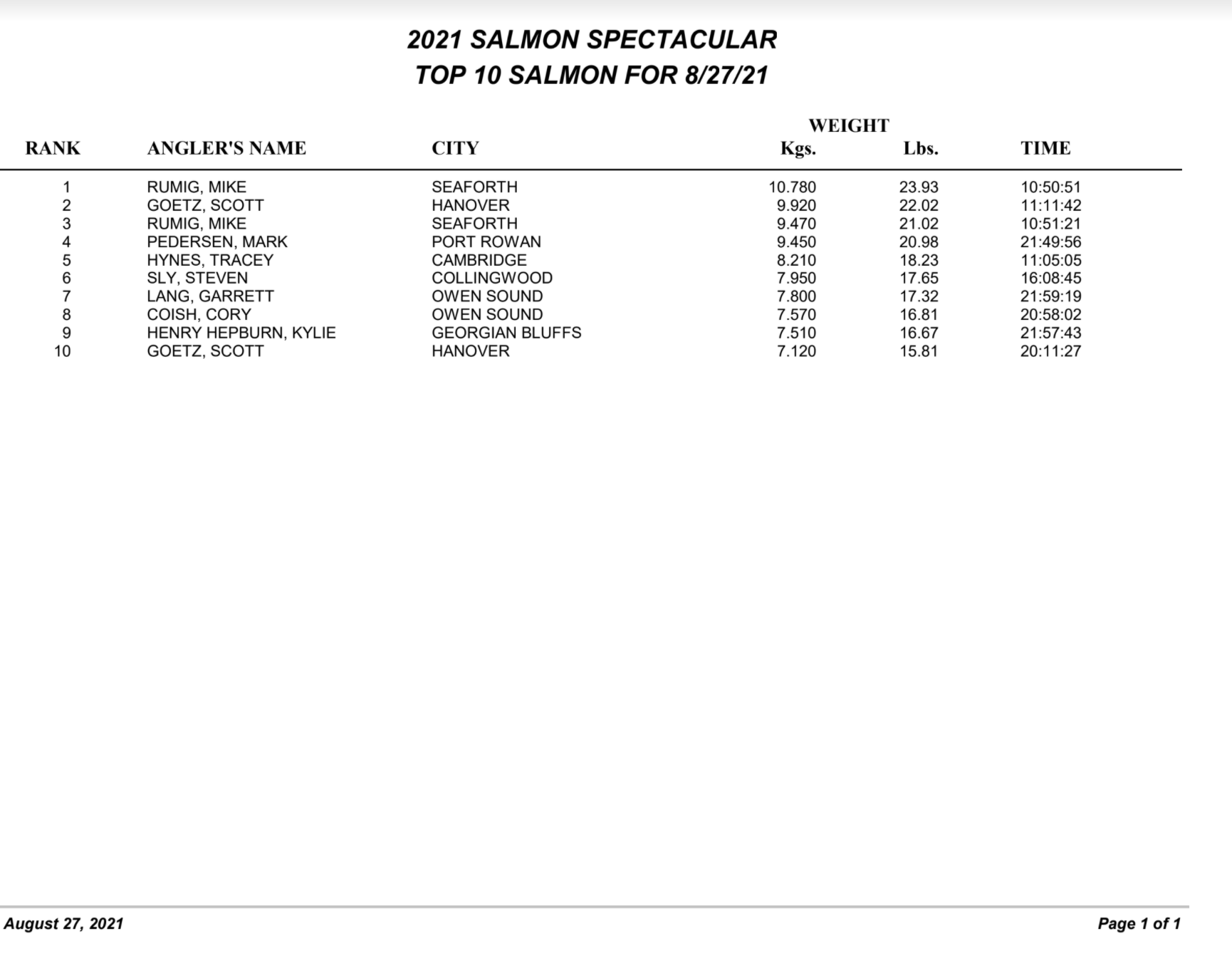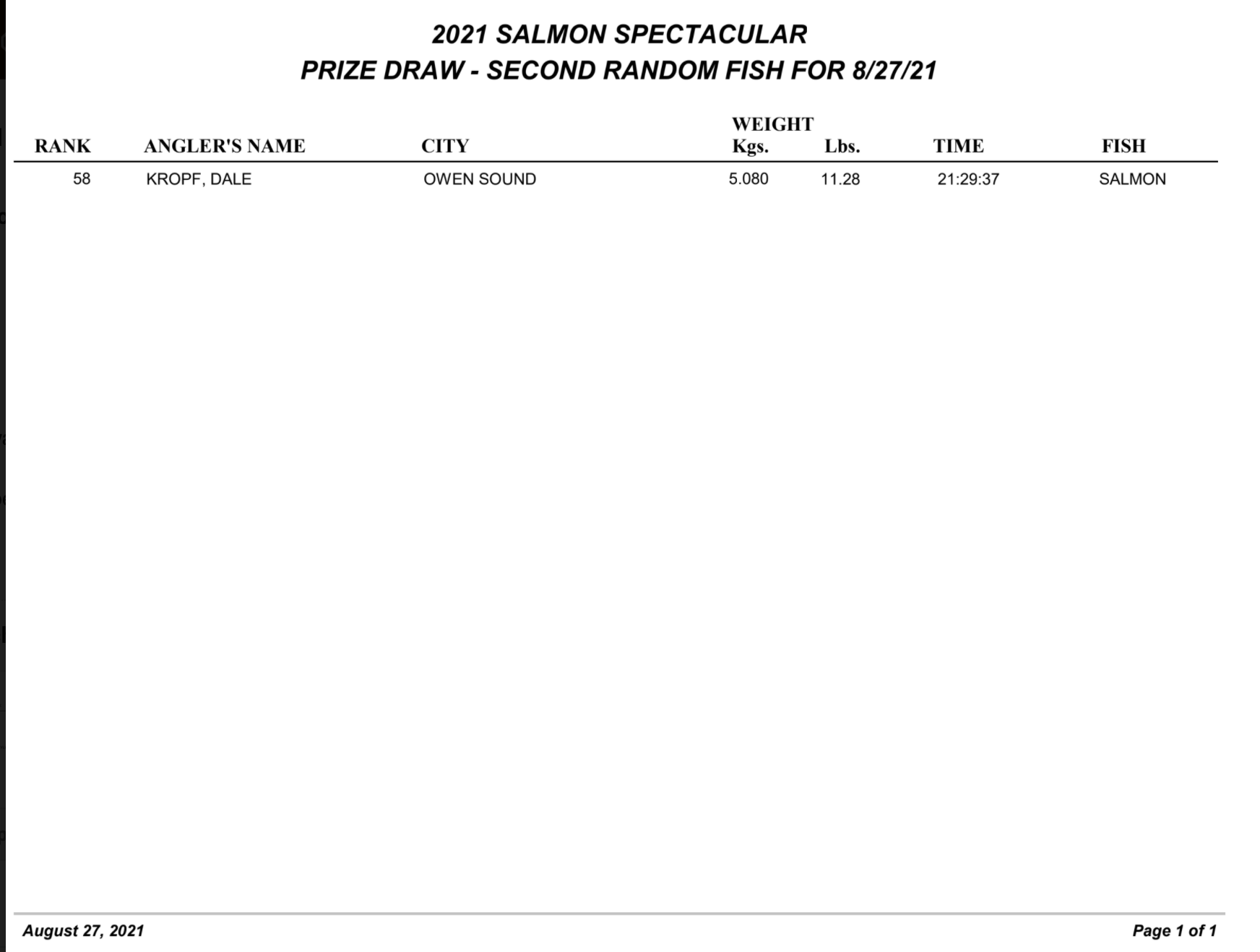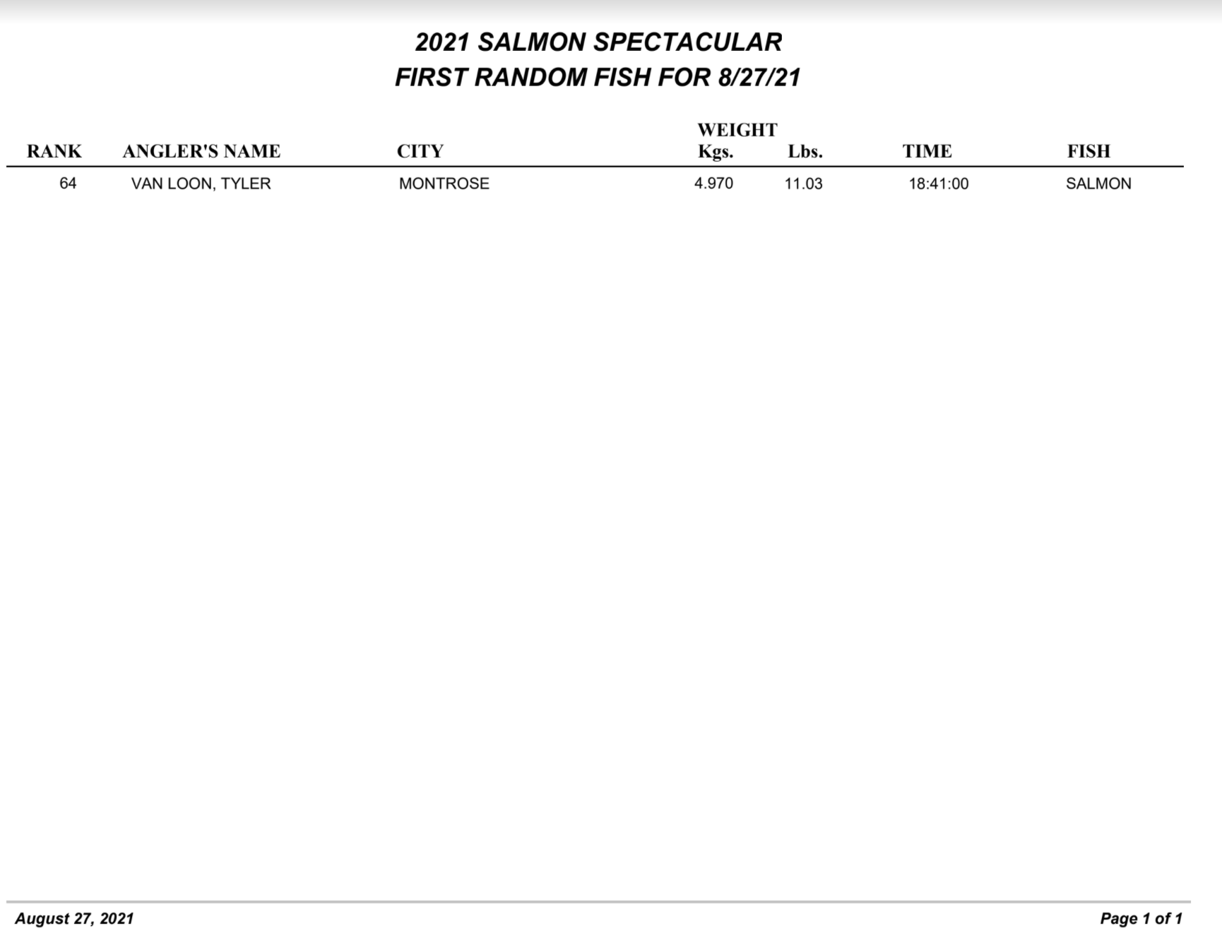 DAY 1 FISHING DERBY RESULTS (Aug 27)